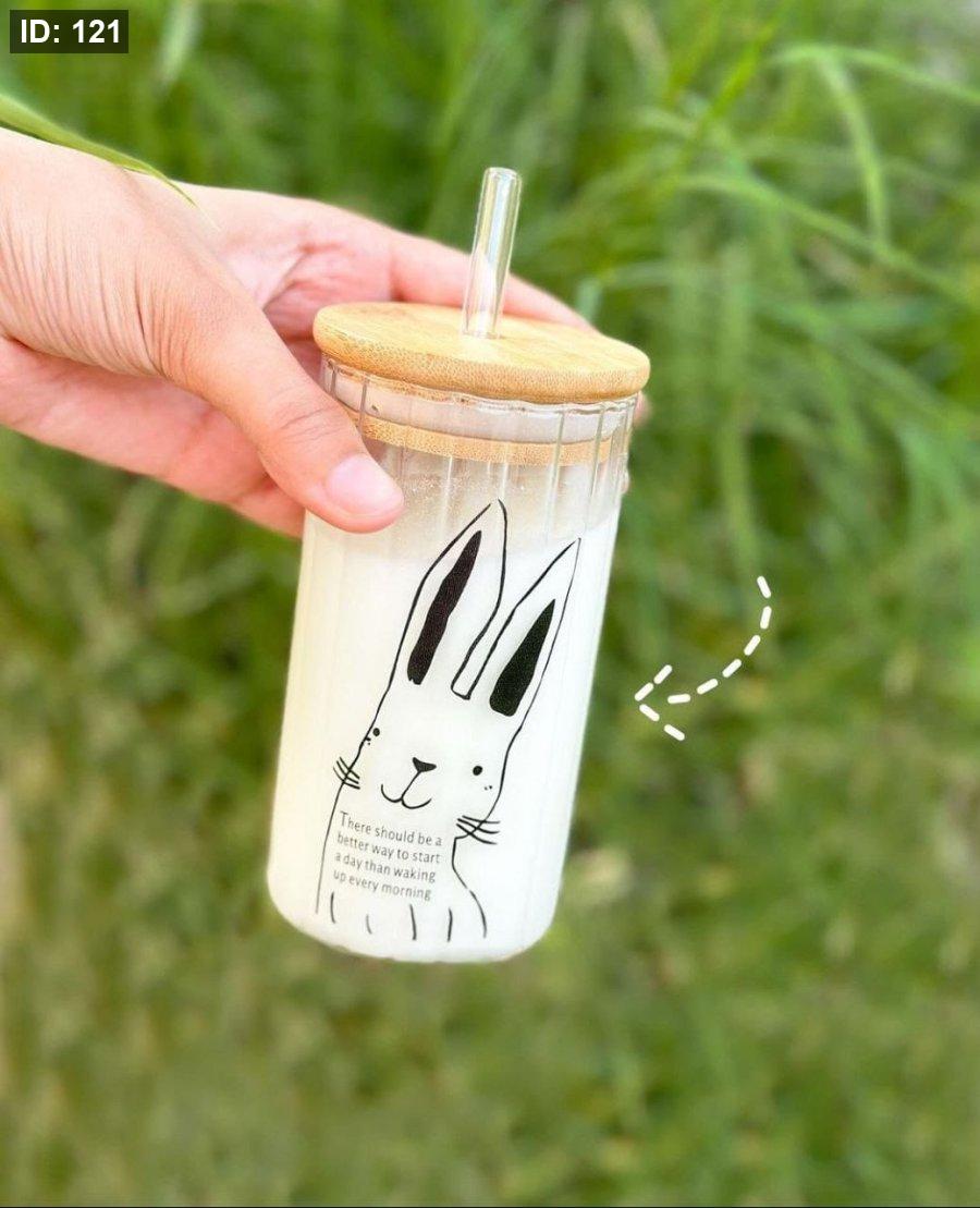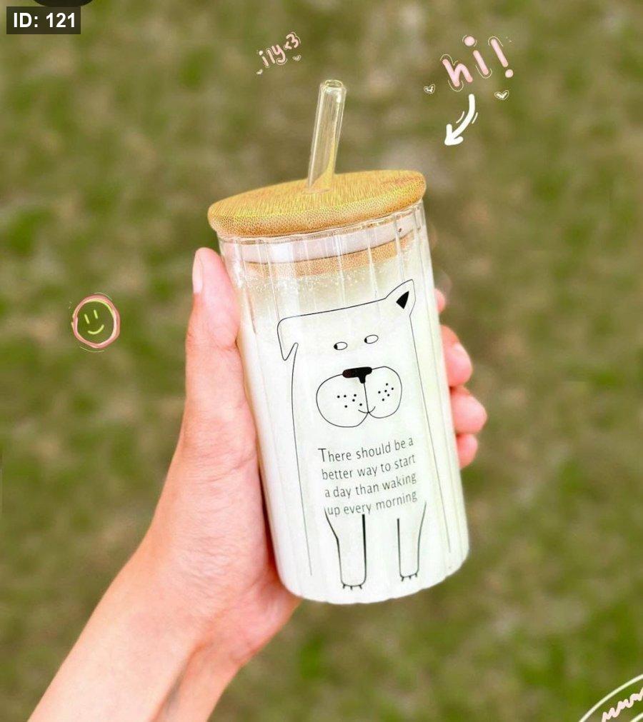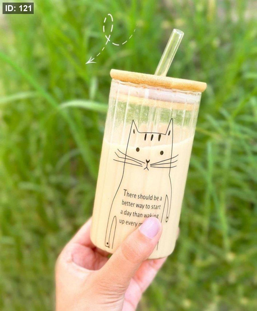 كاسة ايس كوفي محزز مع غطاء خشب بامبو ومصاصة